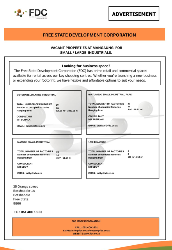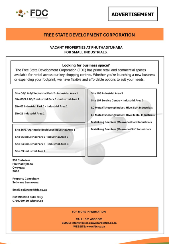 The Free State Development Corporation (FDC) has prime retail and commercial spaces available for rental across our key shopping centres. Whether you’re launching a new business or expanding your footprint, we have flexible and affordable options to suit your needs